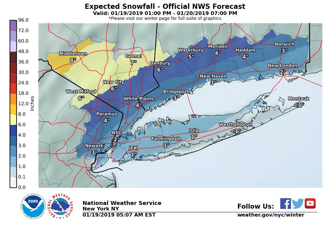 The winter storm warning, which starts at 1 p.m. Saturday and ends at 4 p.m. Sunday, was issued for Sussex, Morris, Bergen, Passaic, Essex and Warren counties. Hudson, Union, Hunterdon, Middlesex and Somerset counties are under a winter weather advisory.