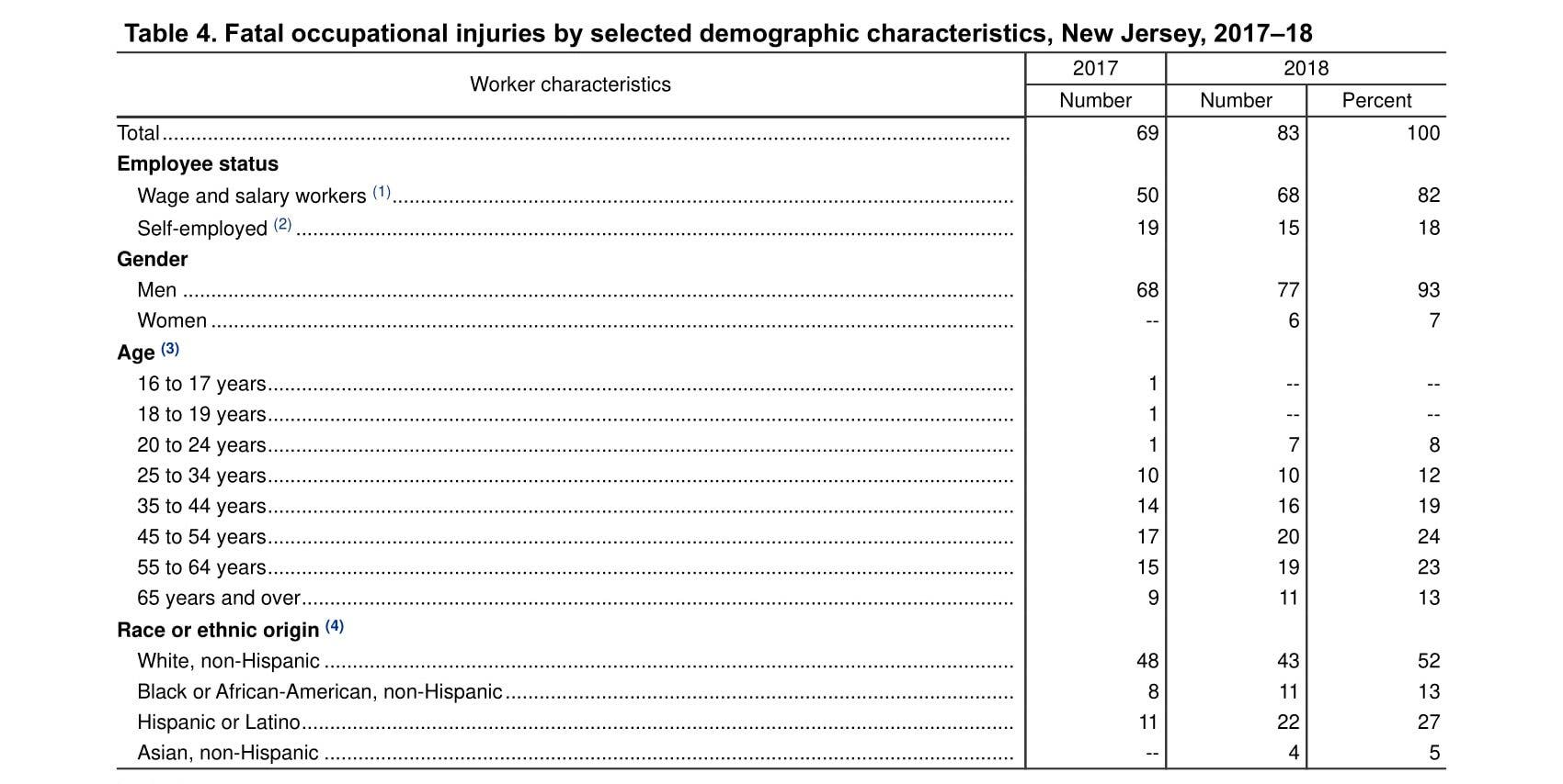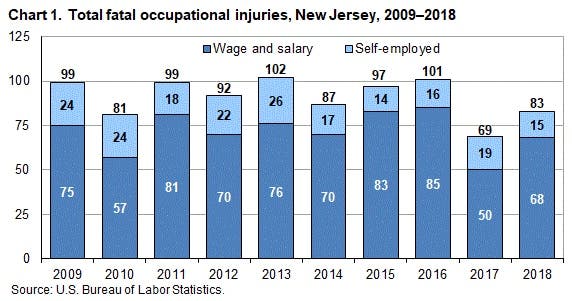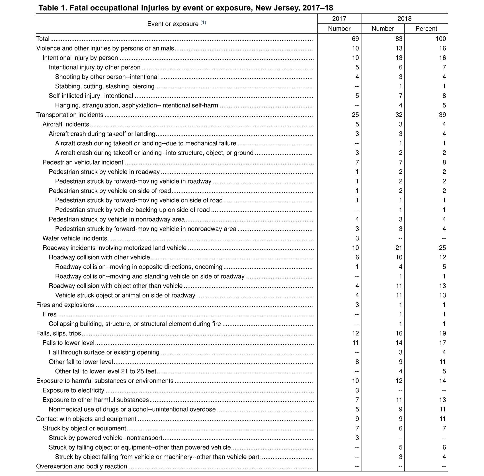 There were 83 fatal work injuries in the Garden State during 2018. Fatal occupational injuries in the state have ranged from a high of 145 in 1993, to a low of 69 in 2017.