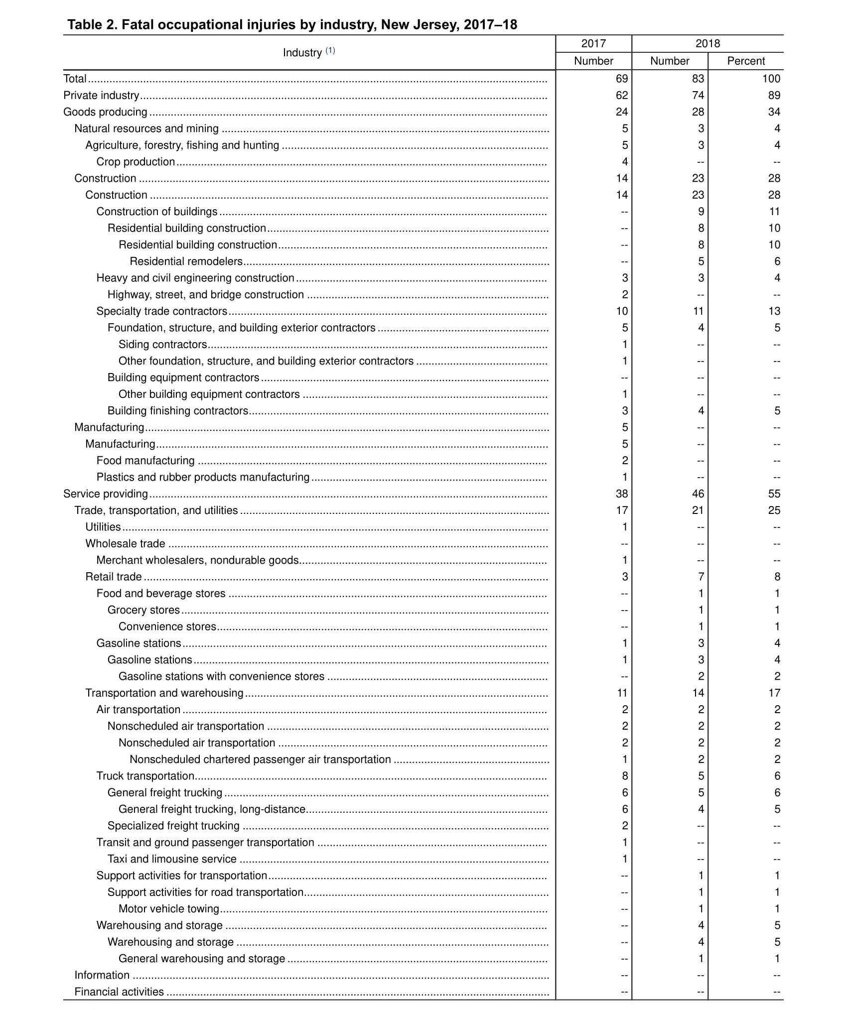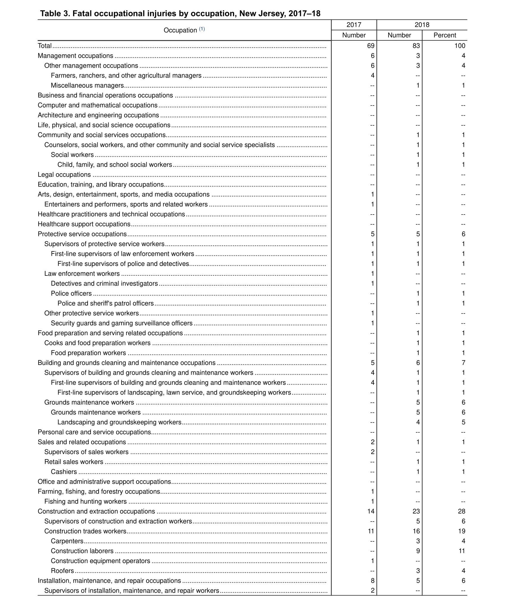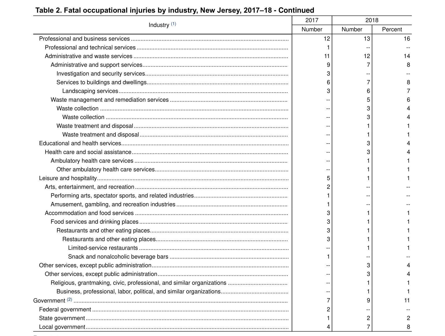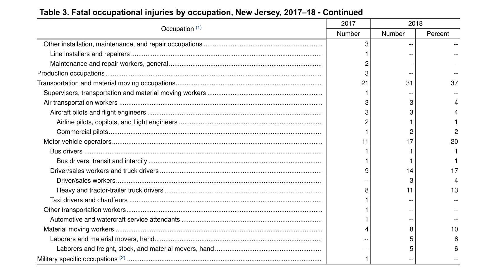 Earlier this week, the BLS published its ranking of “fatal occupational injuries in New Jersey.” The list examines data from 2018, the most recent available. (See the full report)