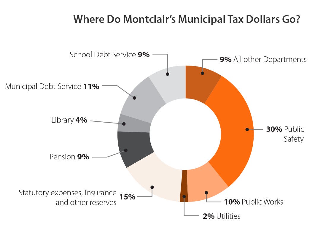 “Public safety is allocated 30 % of total tax dollars (police and fire operations); 15% goes to health and liability insurance, reserves for retiree payouts and uncollected taxes; 9% goes toward employee pension costs. Municipal debt service accounts for 11 % of tax dollars and school debt service accounts for 9% (Montclair is a Type 1 school district which means the Township is required to service school debt).”