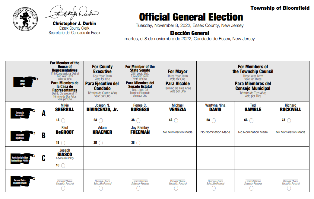 Glance at a ballot from previous elections in Essex County, and you’ll see two horizontal columns filling the top rows (see a sample ballot from 2022 below). Each column, designated “A” and “B,” is reserved for Democratic and Republican Party candidates – the only political parties officially recognized on ballots in New Jersey.
