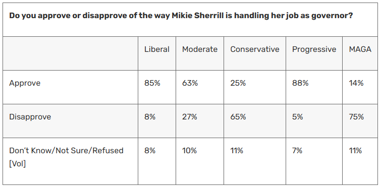 “Sherrill’s approval among her base nears 90 percent: 88 percent of Democrats, 88 percent of progressives and 85 percent of liberal voters in New Jersey approve of how she’s handling her job as governor. Her numbers are also relatively high among groups that weren’t supportive during last year’s election, with 22 percent of Republicans, 25 percent of conservatives, and even 14 percent of MAGA voters currently approving.”