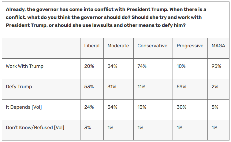 “Independents – and even some Republicans – have nothing bad to say about her yet, and that approval is political capital in her talks with the legislature,” Cassino said.