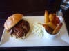 The sandwich is just one of many nice surprises on a pleasantly unique menu. There's what one might expect, baby back ribs with fries and slaw for $12. But there's also fried chicken and waffles—buttermilk marinated chicken over crisp waffles with maple syrup—for $10.