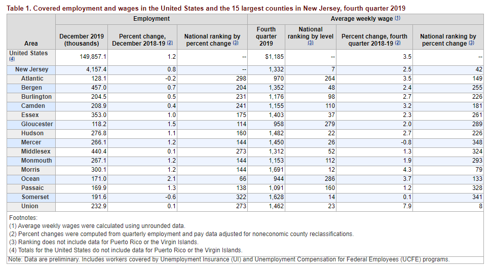 ESSEX COUNTY, NJ — Wages increased in Essex County from the fourth quarter of 2018 to the fourth quarter of 2019, but the rise lagged behind the national average, the U.S. Bureau of Labor Statistics says.