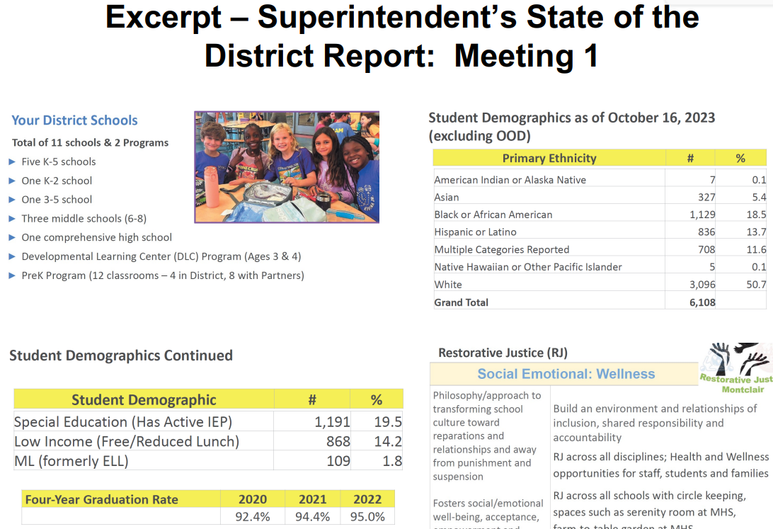 The strategic plan also includes a “State of the Montclair Schools” update from the superintendent’s office, which includes statistics on student demographics (see below).