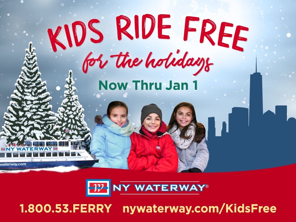 · Kids under 12 can ride on NY Waterway’s ferries for free on all routes beginning Friday, Nov 25th 2022 until Sunday, January 1st 2023. The ticketing policy for the service is: two children are permitted to ride free per each paying adult rider.
