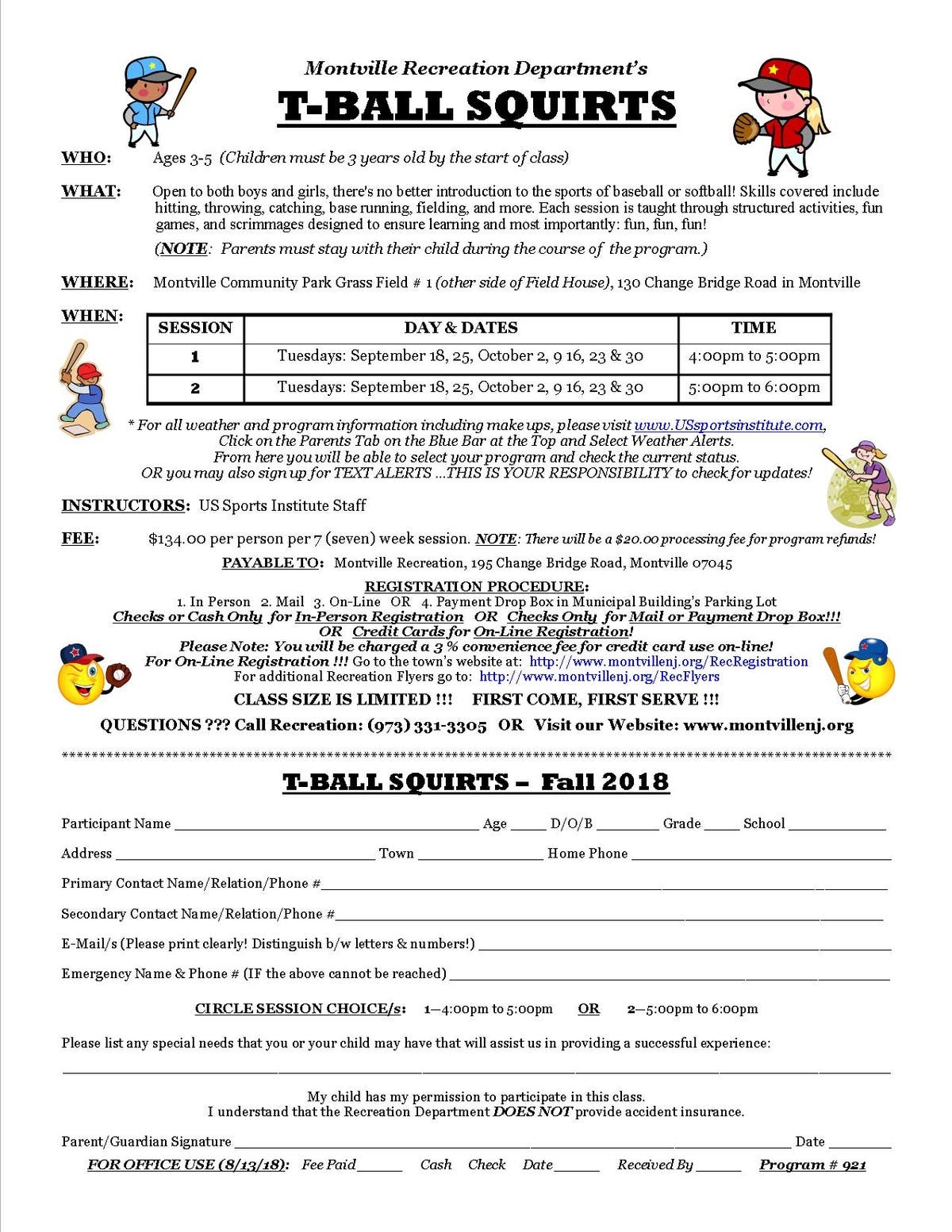 Spots STILL Available for TONIGHT'S T-BALL SQUIRTS classes for Ages 3-5.