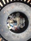 Photo 1: Recyclables mixed in with other refuse inside the trash can in front of Wells Fargo Bank on Main Street.
