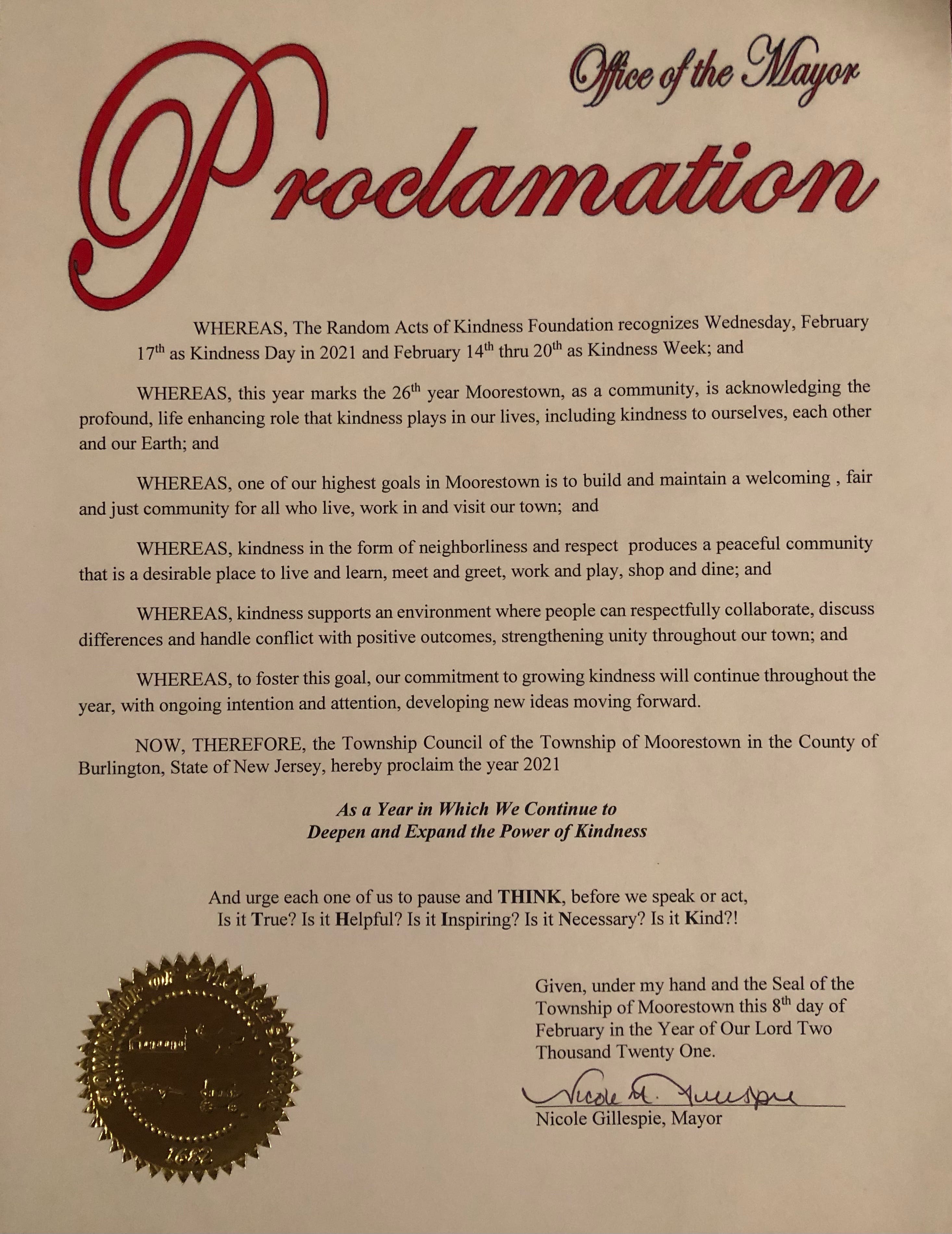 So in addition to recognizing the need for kindness for seven days, Moorestown officials have extended the emphasis to last throughout the year.