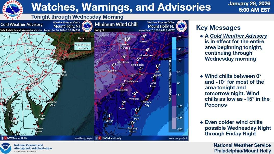 The cold weather advisory is in effect from 7 p.m. Monday to 10 a.m. Wednesday, when wind chills could dip to 7 below zero — cold enough to cause hypothermia if precautions aren't taken.