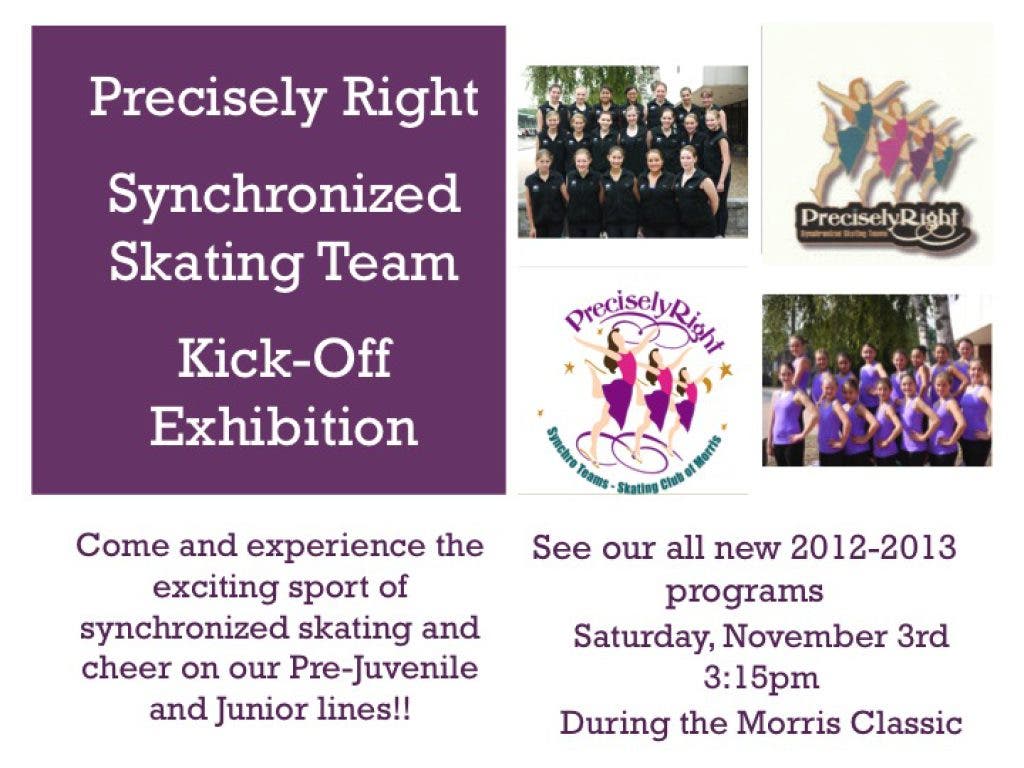 Precisely Right Synchronized Skating Teams will be kicking off the 2012-2013 season with exhibition on November 3rd at Mennen Arena. Come see our Junior and Prejuvenile teams showcase their new programs!