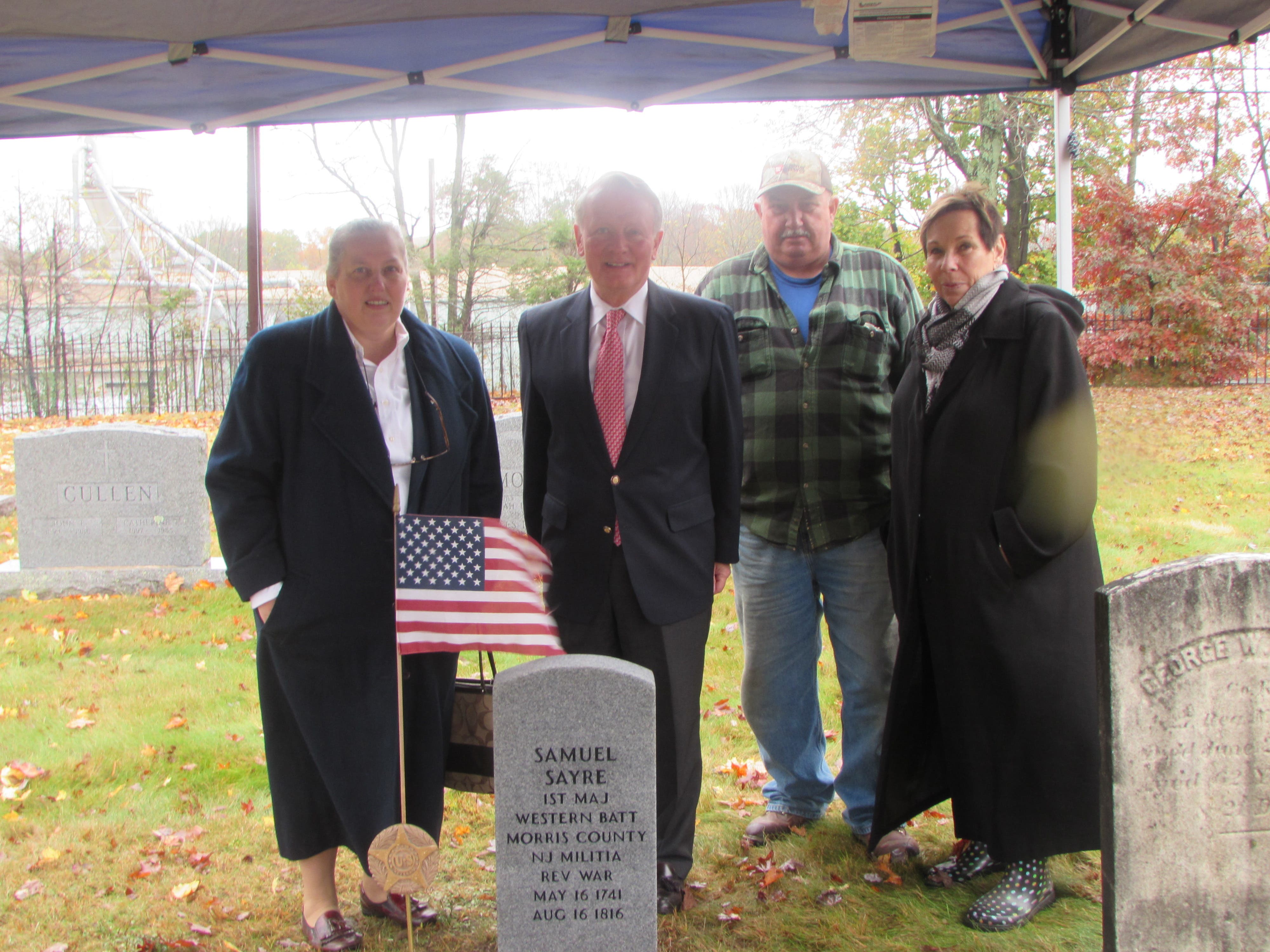 Ms. Livecchia worked collaboratively with Stanhope to rehabilitate the grave of Samuel Sayre, a First Major of the Morris Militia who died in 1816. Mrs. Bobbi Goodman, Director of Constituent Services for Congressman Lance, right, assisted with obtaining next-of-kin permission to rehabilitate the marker and Mr. John Sperry, center, of Stanhope engraved and placed the new stone.