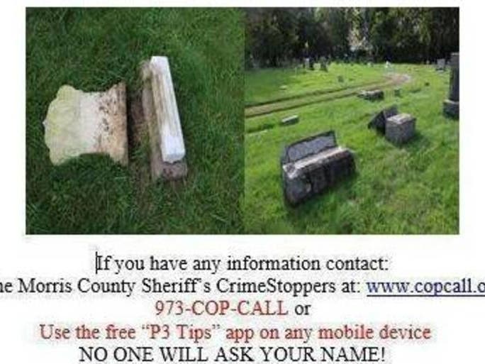 Morris Country Sherriff's office is investigating $6,000 worth of vandalism at a Dover Cementary at the intersection of Orchard and Chestnut Streets in Dover, NJ. Twelve gravestones in Dover cemetery were pushed off their base stones sometime between 6 pm Sunday and 8 pm Monday, October 11, according to Morris County CrimeStoppers. Dover Police and Morris County Sherriff's office are investigating the incident and have asked the public for help. "Anyone with information is asked to call the Morris County Sheriff's CrimeStoppers at 973-COP-Call or visit www.copcall.org. No one will ask your name. You could receive a reward of up to $1,000." - from TapInto.net