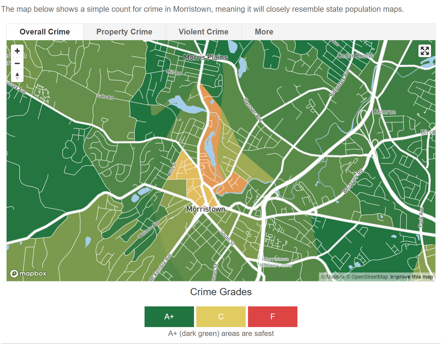 As you can see, crime happens where the people are, and inflated crime rates appear most notably in areas with a low population but a high number of visitors. The town center, where few people live but many people visit due to a large number of retailers, appears to have higher crime rates. In these areas, the best way to gauge safety is to look at the total number of crimes per year on average. More inflated crime rates appear near major airports (of which Morristown has none), parks, and schools. These areas usually have a low population but see many visitors, therefore, driving up the rate of crime per 1,000 residents. Of Morristown's some twenty parks, nearly all see higher than normal crime rates because of the low population but high amount of visitors.