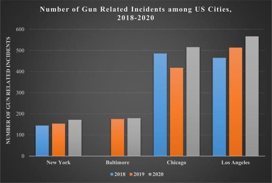 The study found that New York City, according to reports received from the NYPD, saw an 11.7% increase in gun violence from 2019 to 2020, and an 18.6% increase from 2018. Baltimore, Maryland saw a 2% increase in gun violence from 2019 to 2020. And Chicago saw a 23% increase in gun violence from 2019 to 2020. (Mason Sutherland; Mark McKenney, MD, MBA, FACS; Adel Elkbuli, MD, MPH. May 06, 2020)