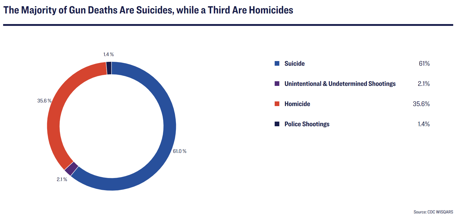 The CDC considers gun-related deaths a national public health emergency and cites the fact that 1 million Americans were killed by guns in the past decade. (Centers for Disease Control and Prevention, “Fatal and Nonfatal Injury Reports,” March 20, 2020) According to CDC reports, an average of 38,826 gun deaths occurs every year.