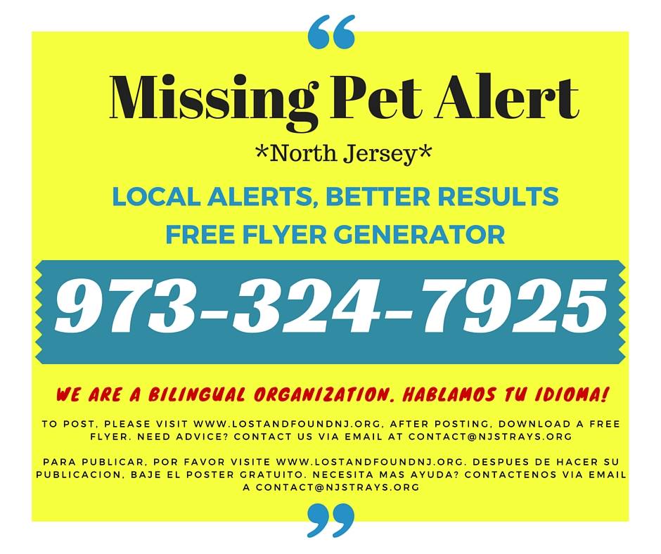 If you have lost or found a pet, please visit http://lostandfoundnj.org/information/report-lost or call 973-324-7925. We are a bilingual organization, any of our free services are provided in English and Spanish.