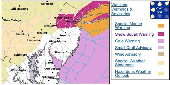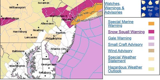 The National Weather Service issued a snow squall warning in several counties, saying "dangerous" squalls were expected to develop and move across the state – especially along and north of the I-80 corridor – during Wednesday afternoon and evening. But the warning was declared in Central Jersey and the Jersey Shore, too.