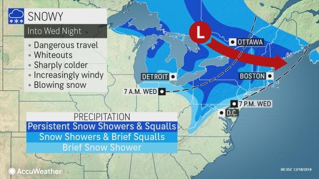 The squalls could produce brief significant reductions in visibility, 40-mph winds and a quick coating of snow, making for potentially hazardous travel conditions, the NWS says.