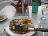 My entree, too, was served without delay. This dish had a lot going on: a large veal chop pounded paper thin, breaded and fried, Milanese style. The veal chop was then covered in a brown brandy cream sauce, topped with sliced red peppers and mushrooms, fresh spinach and cubes of soft fresh mozzarella. This dish had too many flavors and textures coming together and was very rich, and I had a difficult time finishing the plate.