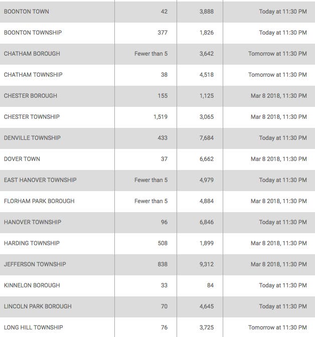 Originally JCP&L said Southern Morris County will see power come back Tuesday night, while the northern half will have to wait until Wednesday night. Now, some towns across the county will have to wait until Thursday night. Some isolated homes could see longer outages, the company warns. (See an updated town-by-town breakdown of current outages and restoration times below).