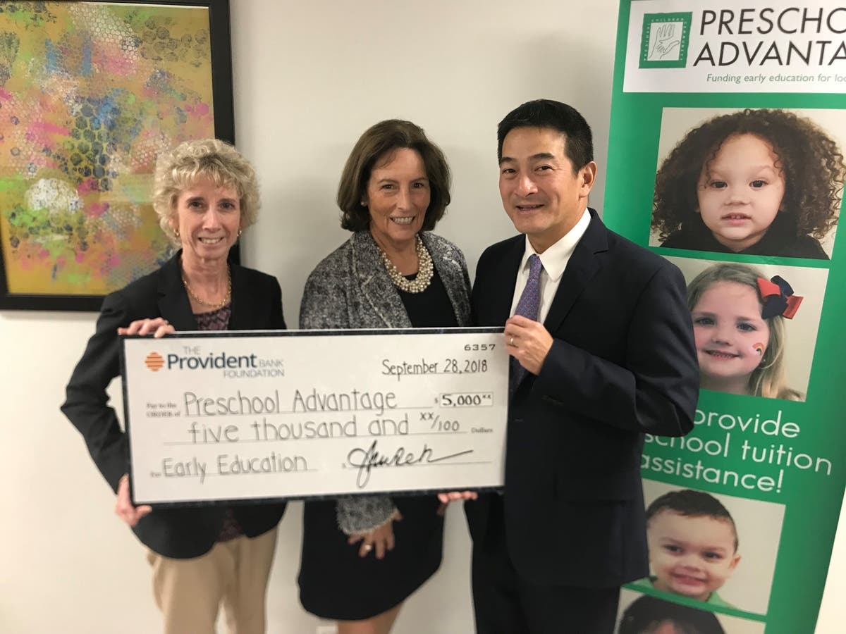 Jane Kurek (center), executive director of The Provident Bank Foundation presented a Community Grant to Preschool Advantage executive director Molly Dunn (left) and board president Eugene Huang (right).