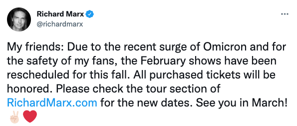 Marx tweeted the following Tuesday: "My friends: Due to the recent surge of Omicron and for the safety of my fans, the February shows have been rescheduled for this fall. All purchased tickets will be honored."