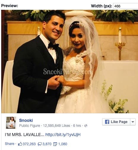 “Here is the first picture of me and Jionni as husband and wife!” Snooki wrote on her website. “Thank you all for all your messages of love and support! We had a magical ceremony and I can’t wait to share more with you soon! Make sure you tune into Snooki and JWOWW on MTV at 10/9c on MTV to see all the precious moments! xoxoxo”