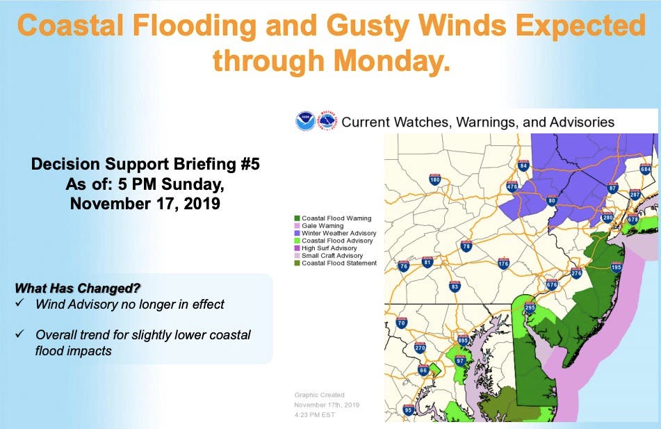 - Minor coastal flooding may be possible on the upper Delaware Bay and tidal Delaware River on Monday. Minor flooding may be possible on the eastern shore of Maryland Monday.