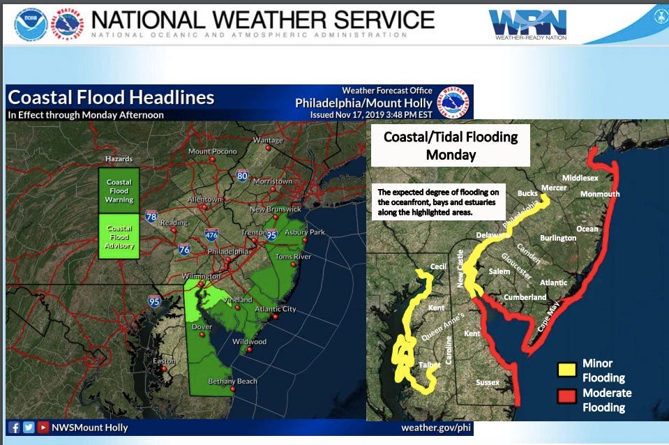 - Moderate coastal flooding is expected for the Monday high tide cycle along the Atlantic coast and the lower Delaware Bay.