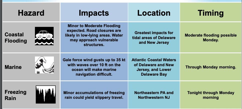 - Light Freezing Rain is expected for northeastern PA and northwestern NJ tonight into Monday morning, which could yield slippery roads during the morning commute.