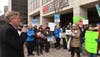 Out on the sidewalk in front of One Gateway, we had impromptu speeches of support from NJ Congressional Representative Frank Pallone and State Assemblyman Tim Eustace. We had many other speeches, as well as singing – led by the Solidarity Singers – and a People’s Mike address which concluded with “Derail Rex. Derail Scott. Derail Rick. Derail Ryan.”