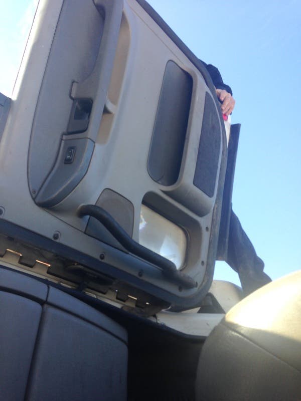 After approaching the overturned tractor trailer, Huson noticed movement in the cab and a body on the driver side door… now the floor of the cab. Huson then went to the back of the cab to climb up to open the top door and get inside.