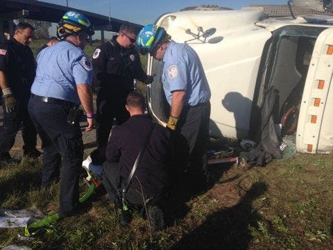 Once the window was removed, emergency personnel evacuated the driver from the overturned vehicle.
