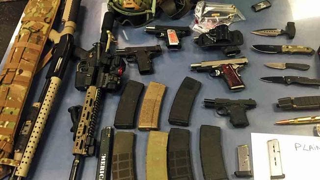 NBC4 said the guns seized included long-range weapons and handguns, as well as a camouflage helmet and what appeared to be night goggles.