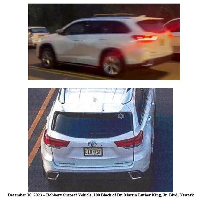A man brandished a handgun and robbed the victim of his personal belongings, then fled the scene in a white 2017 Toyota Highlander bearing New Jersey registration #C18KSF. The car was stolen in Irvington on Saturday, authorities said.