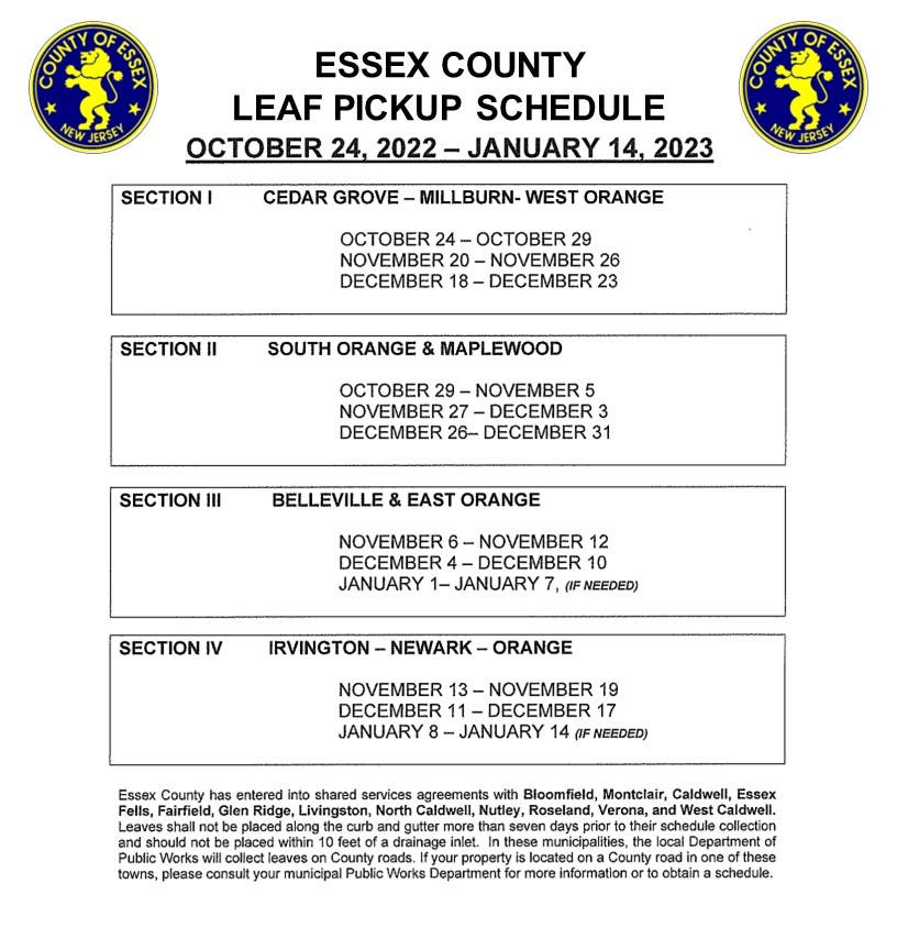 Officials said that residents who have questions about the leaf collection schedule can call the Essex County Department of Public Works at 973-226-8500, ext. 0.
