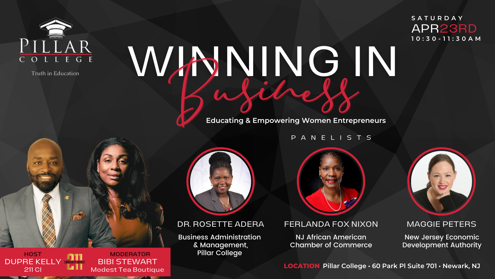 Others participating in this event are moderator Bibi Steward, Owner of Modest Tea Boutique in Newark’s Central Ward, Dr. Rosette Adera, Chair of the Department of Business Administration and Management, Ferlanda Fox Nixon, Esq, Chief of Policy and External Affairs at The African American Chamber of Commerce of NJ and Maggie Peters, Program Manager of New Jersey Economic Development Authority (NJEDA).