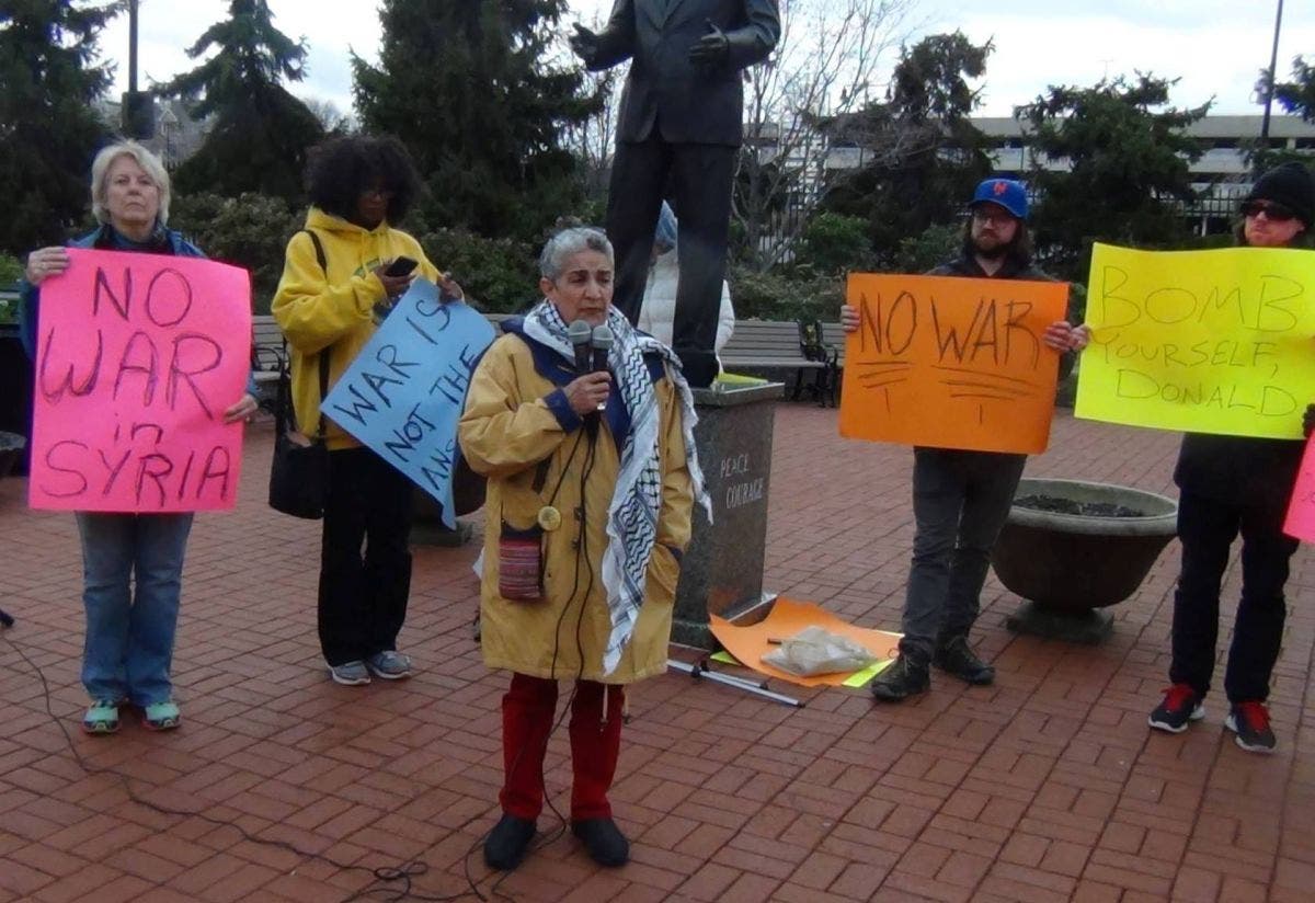 NEWARK, NJ — A handful of Essex County residents and opponents of U.S. wars in the Middle East held a rally in Newark on Friday evening after President Donald Trump authorized a military strike that sent 59 Tomahawk missiles soaring into Syria on Thursday.