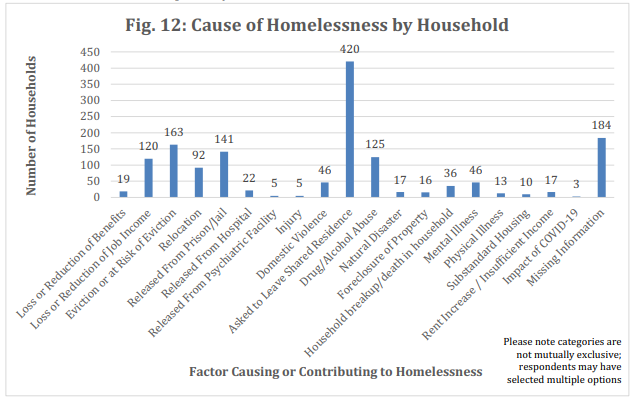 By far, the most common cause of homelessness in the county was “being asked to leave a shared residence” (about 31.9 percent of those surveyed).