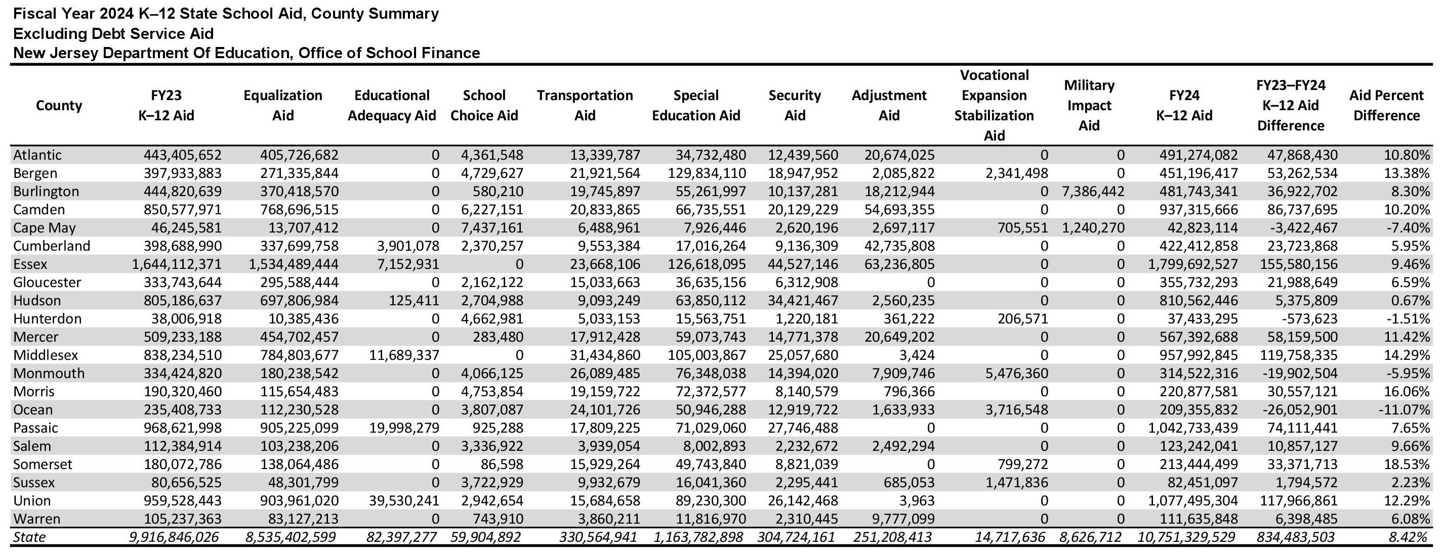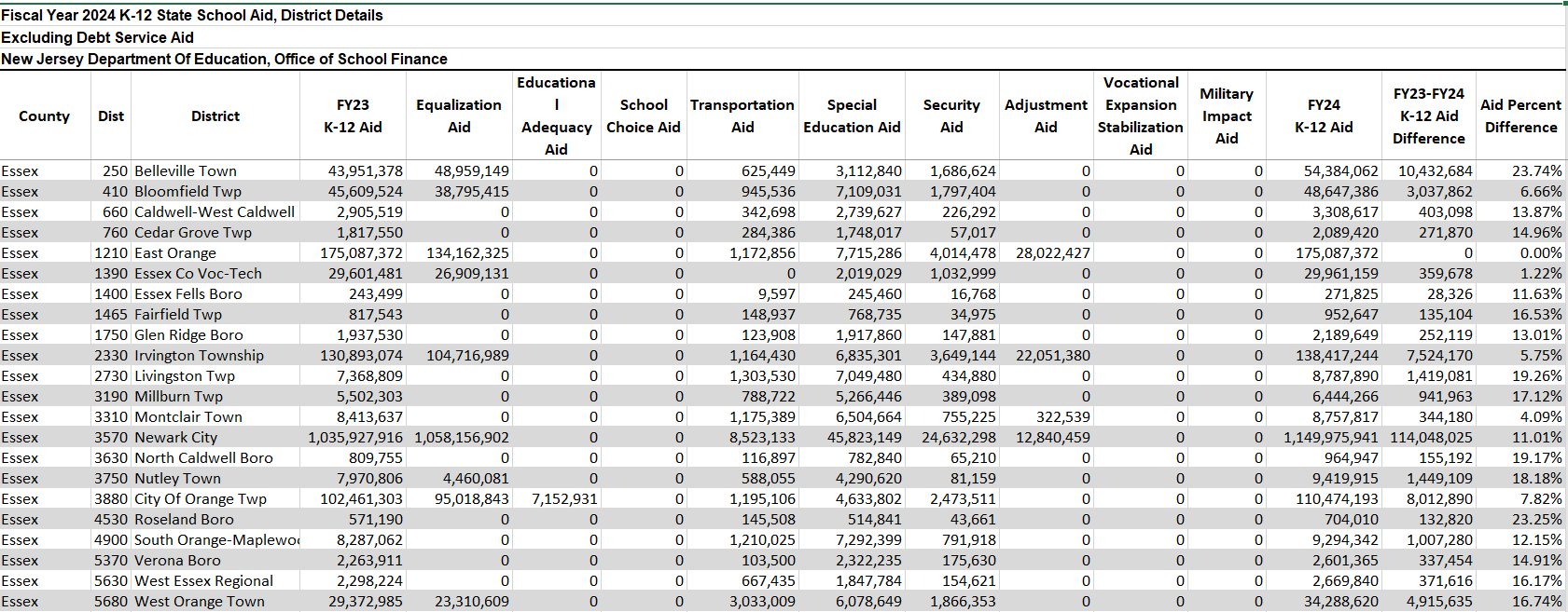 Individual school districts in Essex County would get a combined $1.79 billion in K-12 aid, about 9.46 percent more than last year. Read More: NJ School Aid 2023: Who's Getting More, Who's Getting Less