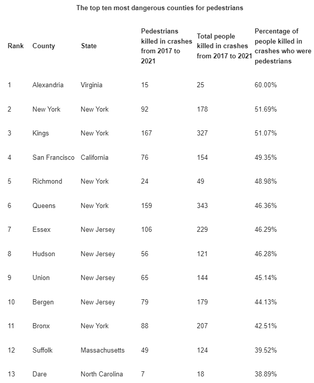 Essex County ranked seventh on the list with 106 pedestrian fatalities, making up 46.29 percent of all traffic deaths (see the top 10 locations below).