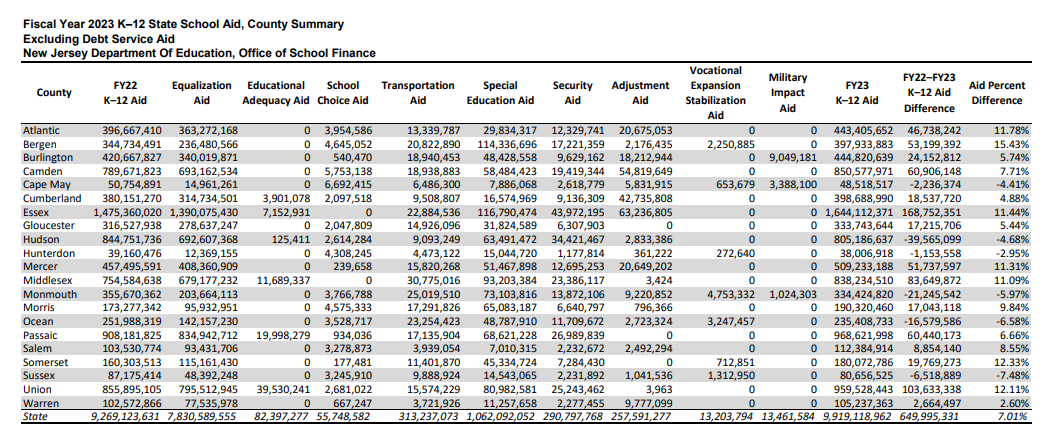 Overall, Essex County will see an 11.44 percent bump in school aid, putting its total at $1.64 billion, the highest of any county in New Jersey by a wide margin. Passaic County has the next-highest total at $968.62 million, a 6.66 percent increase from last year.