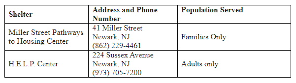 During Code Blue alerts, emergency shelters are open for people experiencing homelessness and others in need. For more information, contact the shelters listed below, or the Office of Homeless Services at: (973) 877-9481, Monday through Friday, 8:30 a.m. to 4:30 p.m.