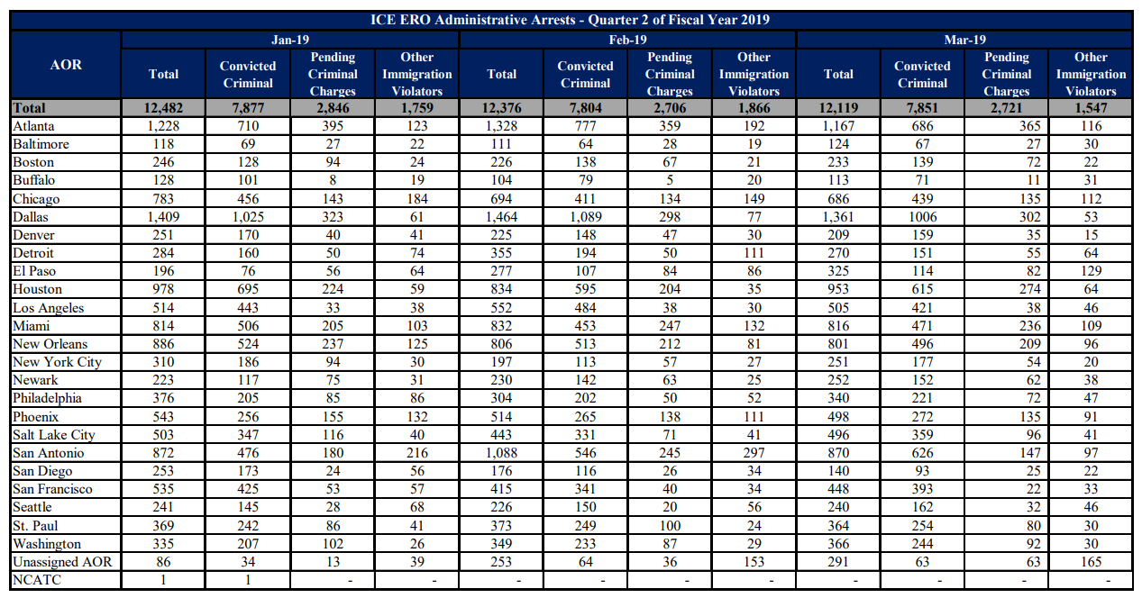 ICE released its second quarter enforcement data for FY19 earlier this week. The report covers from January to March. It included local statistics for the Newark ERO field office, which processes detainees from across the state.