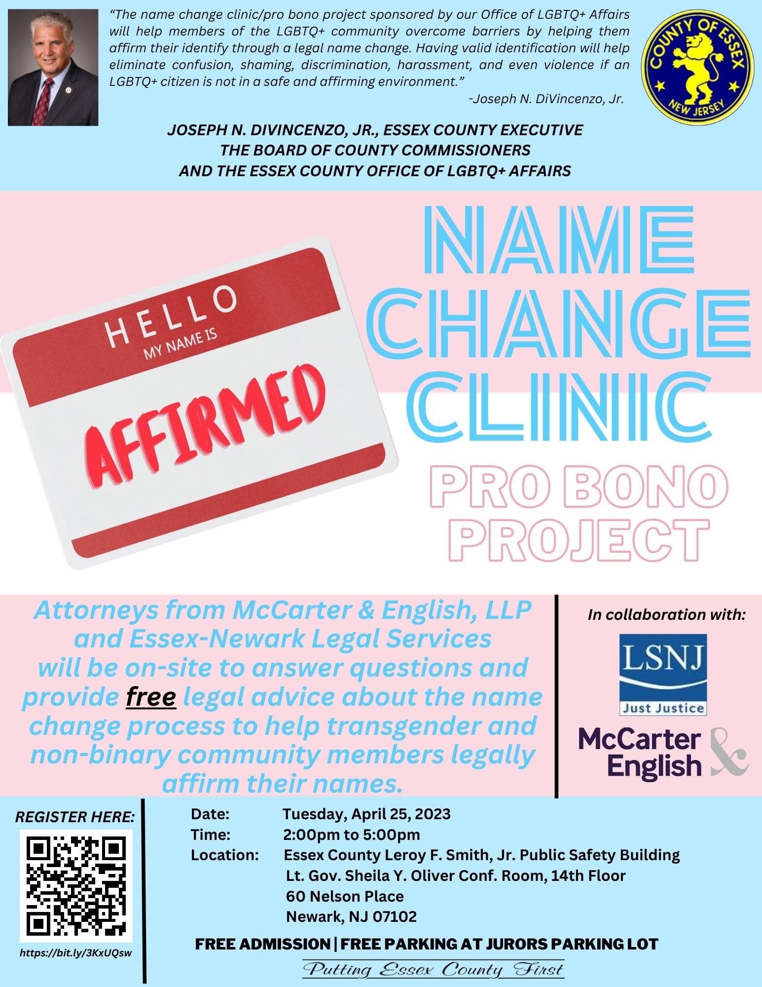 According to the Essex County Office of LGBTQ+ Affairs, attorneys from McCarter & English LLP and Essex-Newark Legal Services will be on site at the public event. They will provide advice about the name change process and how to legally affirm names.