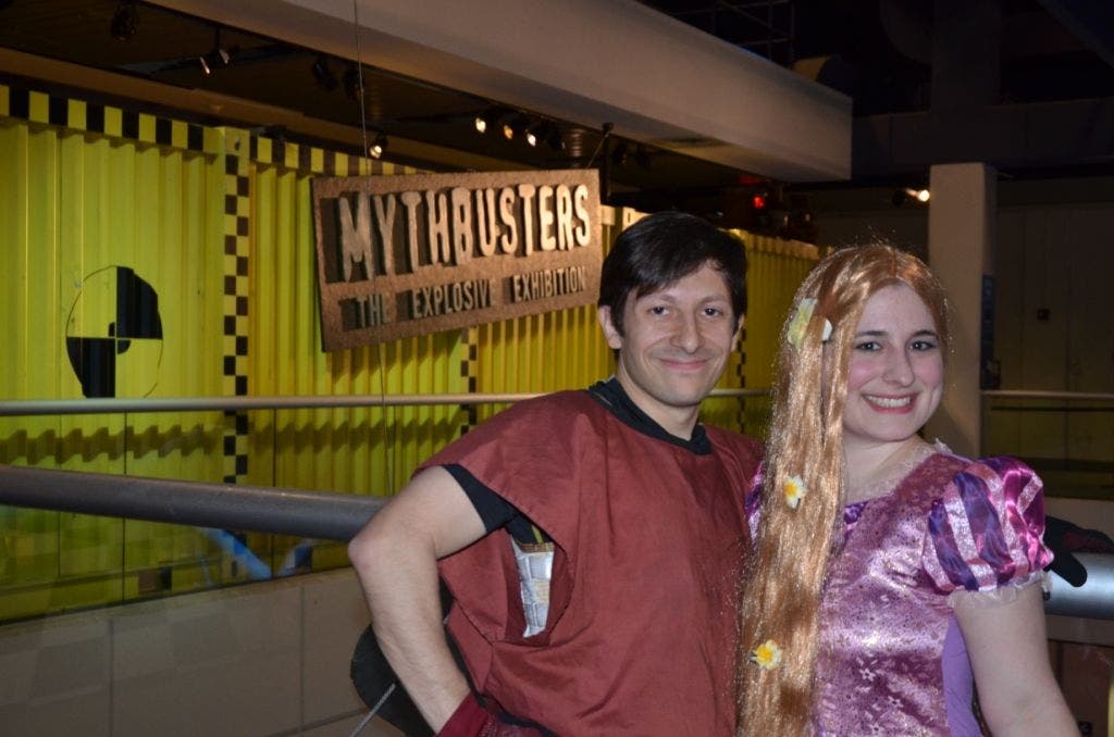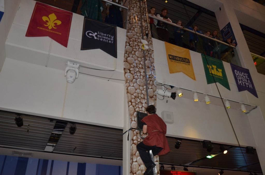 In connection with the Liberty Science Center’s feature exhibit, “MythBusters: The Explosive Exhibition,” a stuntman climbed a simulated version of “Rapunzel’s hair” alongside a 40-foot castle in the heart of Liberty State Park last Saturday in an effort to test the validity of the tall tale.
