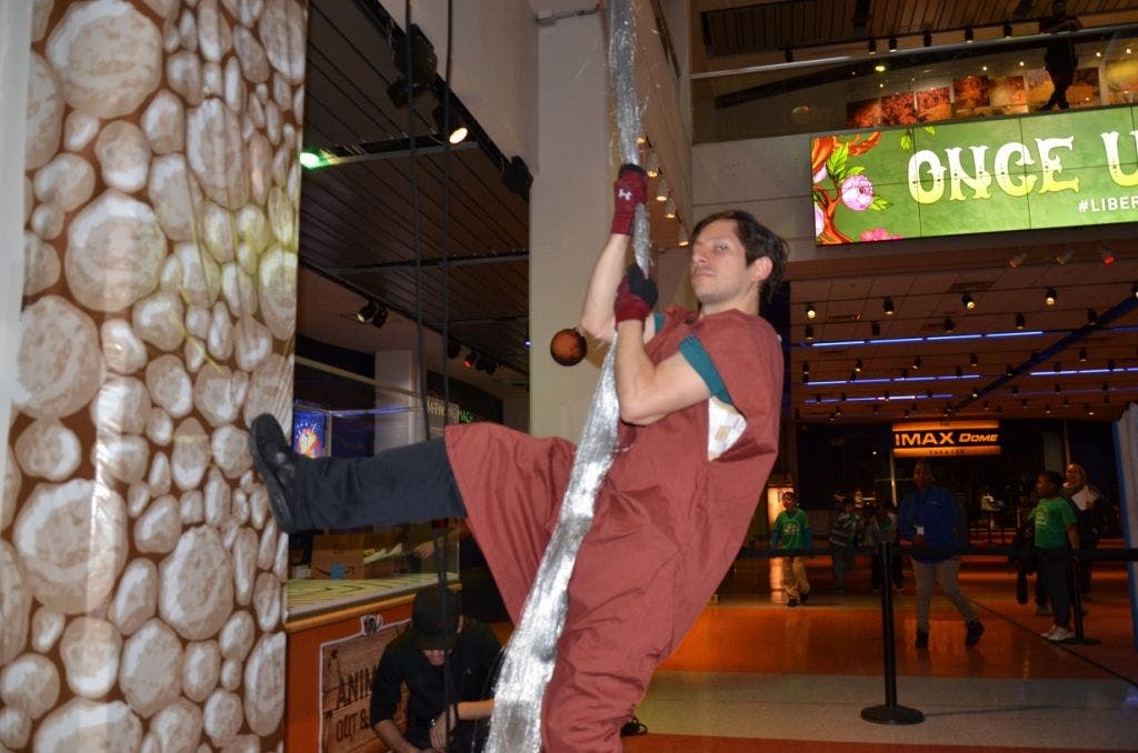 “Finally, the team spent roughly 10 hours unspooling 20 pounds of aluminum into a 70-foot ponytail and fastened it to a column in our atrium so our stuntman could attempt the climb.”
