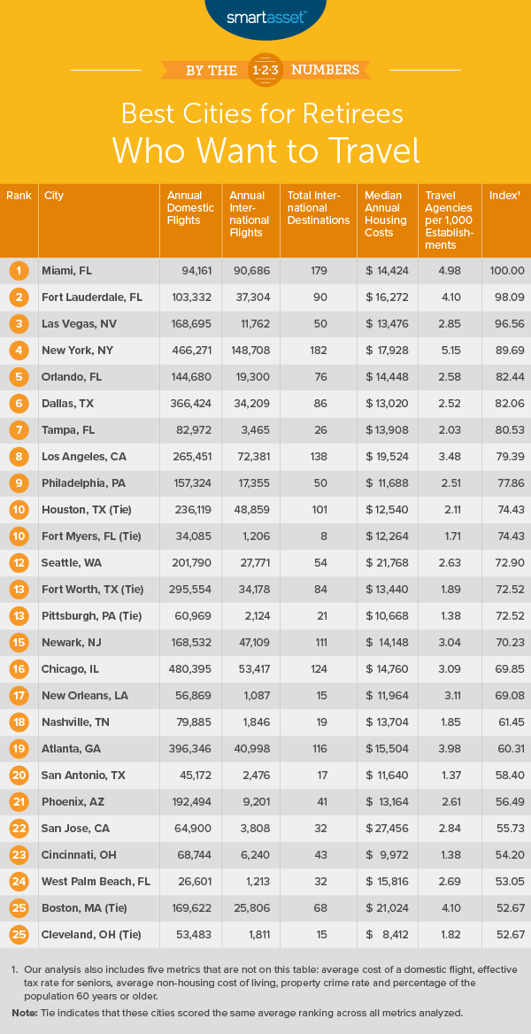 Researchers based their findings on “travel accessibility” and “financial security for retirees,” including the number of annual flights, median annual housing costs, property crime rate per 100,000 residents and non-housing cost of living. See the full list and the methodology.
